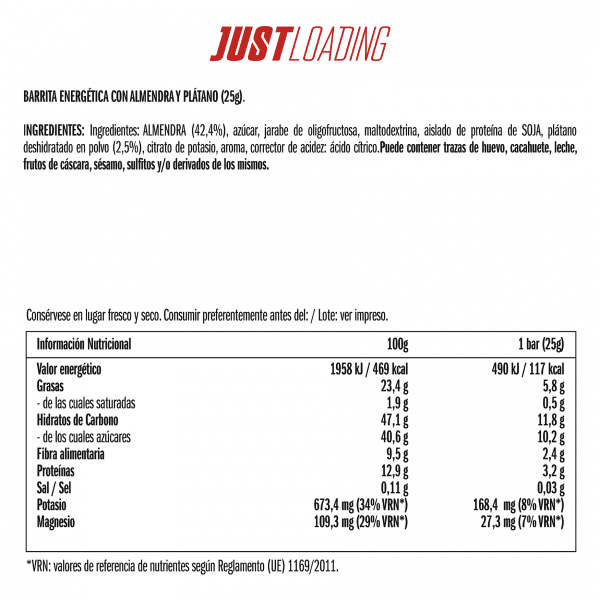 Las barritas energéticas Just Loading son un suplemento nutricional que se utiliza para cubrir necesidades (principalmente de carbohidratos) para los entrenamientos de larga duración. La barrita de almendra y plátano de Just Loading retrasa la fatiga durante el entrenamiento (por ejemplo, de bicicleta o running) y son libres de gluten. Además, ¡tienen un 42% de almendra!