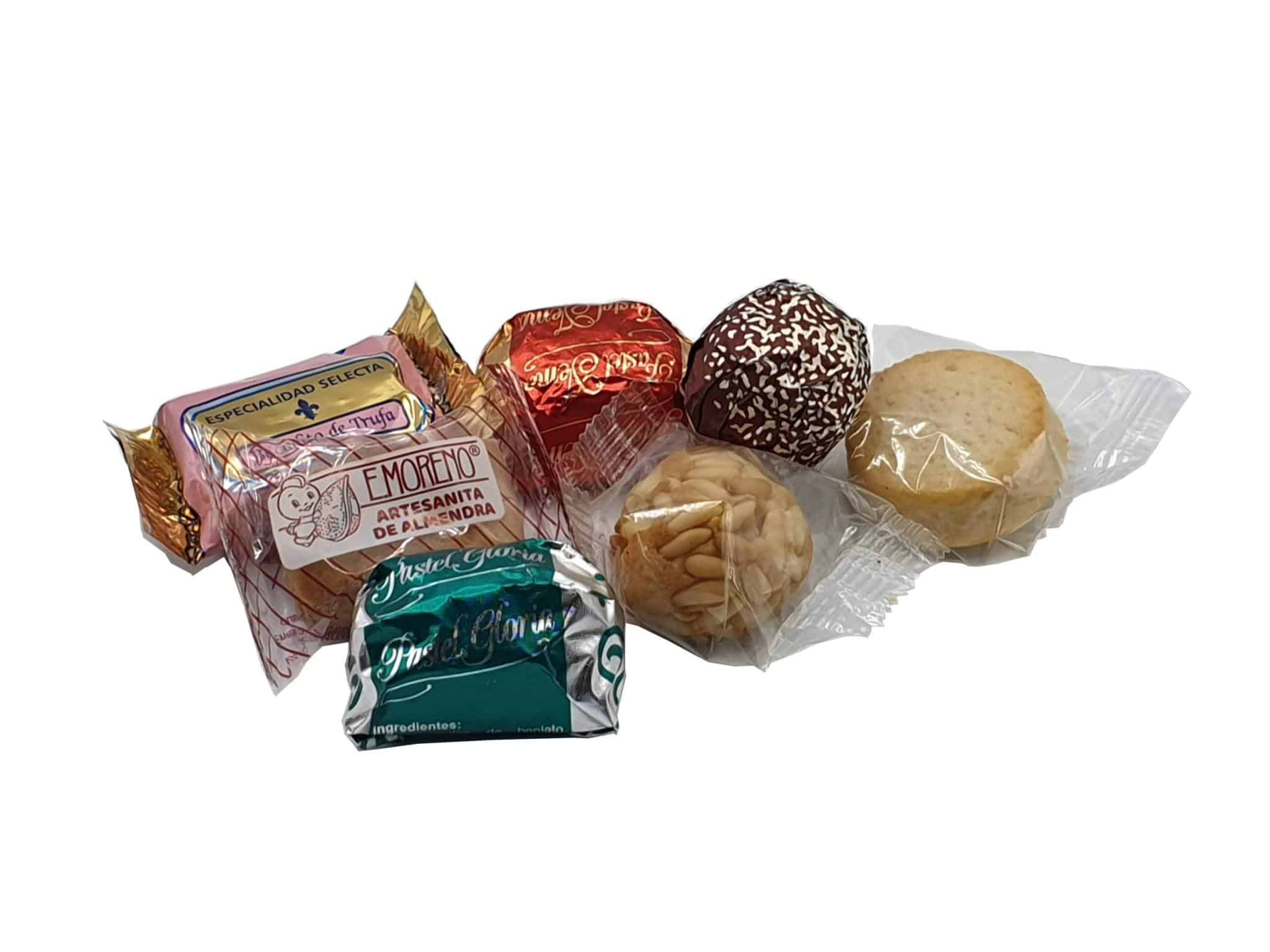 Nuestra Bolsa especial de Navidad de 1 kg contiene las siguientes variedades: Pastel de Gloria, Pastel de Yema, Piñonate, Pastelito de Mazapán, Láminas de Naranja con Chocolate Negro, Láminas de Limón con Chocolate Blanco, Especialidades de Chocolate y Yemitas.