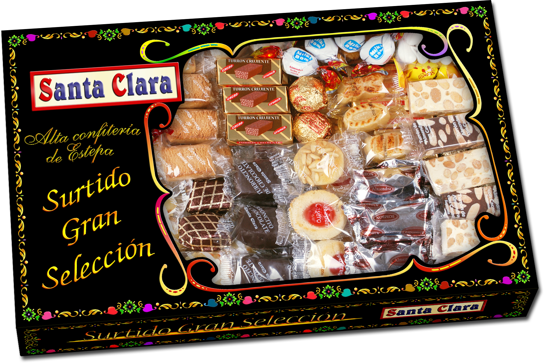 CONTENIDO E INGREDIENTES: Clarisa 8%: Harina de TRIGO con GLUTEN, Azúcar, Manteca de cerdo, ALMENDRA, Canela y Vainillina. Valores nutricionales por 100g: Valor energético (2045KJ/489Kcal), Grasas (totales 26, saturadas 6), Hidratos de carbono (totales 56, azúcares 26), Proteínas 8, Sal 0,1. Alfajor de almendra 8%: Harina de TRIGO con GLUTEN, Azúcar, Manteca de cerdo, ALMENDRA 8%, Cacao en polvo, Canela, SESAMO, Aroma de limón, Vainillina. Valores nutricionales por 100g: Valor energético (1972KJ/471Kcal), Grasas (totales 24, saturadas 10), Hidratos de carbono (totales 60, azúcares 27), Proteínas 7, Sal 0,1. Almendra rellena 2%: CACAHUETE, Azúcar, grasa vegetal de palma, Obleas (harina de TRIGO con GLUTEN, emulsionante lecitina de SOJA E322, gasificante E500ii y colorante E171) y esencia de almendra. Valores nutricionales por 100g: Valor energético (2172KJ/520Kcal), Grasas (totales 29, saturadas 3), Hidratos de carbono (totales 49, azúcares 49), Proteínas 15, Sal 0,05. Bolita de coco 7%: Coco rallado 30%, Cobertura de chocolate (azúcar, grasa vegetal de palmiste totalmente hidrogenada, cacao desgrasado en polvo, emulgente lecitina de SOJA, aroma y canela), Glucosa, Azúcar invertido (azúcares, agua, acidulante E330, estabilizante E500, conservador E202), LECHE condensada (LECHE fresca y azúcar), copos de patata deshidratados(E471, E450i, E304 y E223), Sorbitol, acidulante E330 y conservador E202. Valores nutricionales por 100g: Valor energético (1913kJ/458kcal), Grasas (totales 24, saturadas 9), Carbohidratos (totales 51, azúcares 46), Proteínas 8, Sal 0,1. Turrón crujiente 6%: Cobertura de chocolate 92% (azúcar, grasa vegetal hidrogenada (palmiste, coco, palma y girasol), cacao en polvo desgrasado (cacao mínimo 9%), LECHE en polvo desnatada, LACTOSUERO en polvo, emulgente lecitina de SOJA, antioxidantes E304 y E306, vainillina y canela), Arroz inflado (harina de arroz, harina de TRIGO con GLUTEN, azúcar, extracto de malta de CEBADA y sal) y AVELLANA. Valores nutricionales por 100g: Valor energético (2 171KJ/519Kcal), Grasas (totales 27, saturadas 21), Hidratos de carbono (totales 62, azúcares 44), Proteínas 6, Sal 0,4. Peladilla 3%: Azúcar, ALMENDRA y Abrillantadores E901 y E903. Valores nutricionales por 100g: Valor energético (1829KJ/438Kcal), Grasas (totales 10, saturadas 0,7), Hidratos de carbono (totales 83, azúcares 82), Proteínas 4, Sal 0. Pastel de almendra 18%: ALMENDRA 40%, Azúcar, Fécula, Cabello de ángel (pulpa de calabaza, jarabe de glucosa y fructosa, almidón de maíz modificado E1442, espesantes E407 y E410, acidulantes E330 y E331, conservadores E202 y E223), Glucosa, Aroma de limón, Conservador E202, Antioxidante E334. Valores nutricionales por 100g: Valor energético (1791kJ/428kcal), Grasas (totales 20, saturadas 2), Carbohidratos (totales 51, azúcares 47), Proteínas 9, Sal 0,1. Bombón de almendra 13%: ALMENDRA 32%, Azúcar, Cobertura de chocolate (azúcar, grasa vegetal de palmiste totalmente hidrogenada, cacao desgrasado en polvo, emulgente lecitina de SOJA, aroma y canela), Fécula, Cabello de ángel (pulpa de calabaza, jarabe de glucosa y fructosa, almidón de maíz modificado E1442, espesantes E407 y E410, acidulantes E330 y E331, conservadores E202 y E223), Glucosa, Aroma de limón, Conservador E202, Antioxidante E334. Valores nutricionales por 100g: Valor energético (1913kJ/458kcal), Grasas (totales 24, saturadas 9), Carbohidratos (totales 51, azúcares 46), Proteínas 8, Sal 0,1. Turroncitos 5%: Azúcar, ALMENDRA, Harina de TRIGO con GLUTEN y Miel. Valores nutricionales por 100g: Valor energético (1938KJ/463Kcal), Grasas (totales 23, saturadas 2), Hidratos de carbono (totales 57, azúcares 36), Proteínas 10, Sal 0,1. Turroncito con cacao 6%: Azúcar, ALMENDRA, Cobertura con grasa vegetal 22%(azúcar, grasa vegetal de palmiste totalmente hidrogenada, cacao desgrasado en polvo 20%, emulgente lecitina de SOJA, aroma y canela), Harina de TRIGO con GLUTEN y Miel.. Valores nutricionales por 100g: Valor energético (2045KJ/489Kcal), Grasas (totales 26, saturadas 6), Hidratos de carbono (totales 56, azúcares 26), Proteínas 8, Sal 0,1. Pastel con guinda 3%: ALMENDRA, Azúcar, Fécula, Cabello de ángel (pulpa de calabaza, jarabe de glucosa y fructosa, almidón de maíz modificado E1442, espesantes E407 y E410, acidulantes E330 y E331, conservadores E202 y E223), Glucosa, Cereza confitada (cerezas, azúcar, jarabe de glucosa y fructosa, acidulante E330, colorante E127 y conservadores E202 y E223), Aroma de limón, Conservador E202, Antioxidante E334. Valores nutricionales igual que Pastel de almendra. Piñonate 4%: ALMENDRA, Azúcar, Fécula, Cabello de ángel (pulpa de calabaza, jarabe de glucosa y fructosa, almidón de maíz modificado E1442, espesantes E407 y E410, acidulantes E330 y E331, conservadores E202 y E223), Glucosa, Piñones 5%, Aroma de limón, Conservador E202, Antioxidante E334. Valores nutricionales igual que Pastel de almendra. ALERGENOS: Todos los artículos pueden contener trazas de: GLUTEN, HUEVO, CACAHUETE, SOJA, LECHE, otros FRUTOS DE CASCARA, SESAMO y SULFITOS aunque no estén especificados como ingrediente.